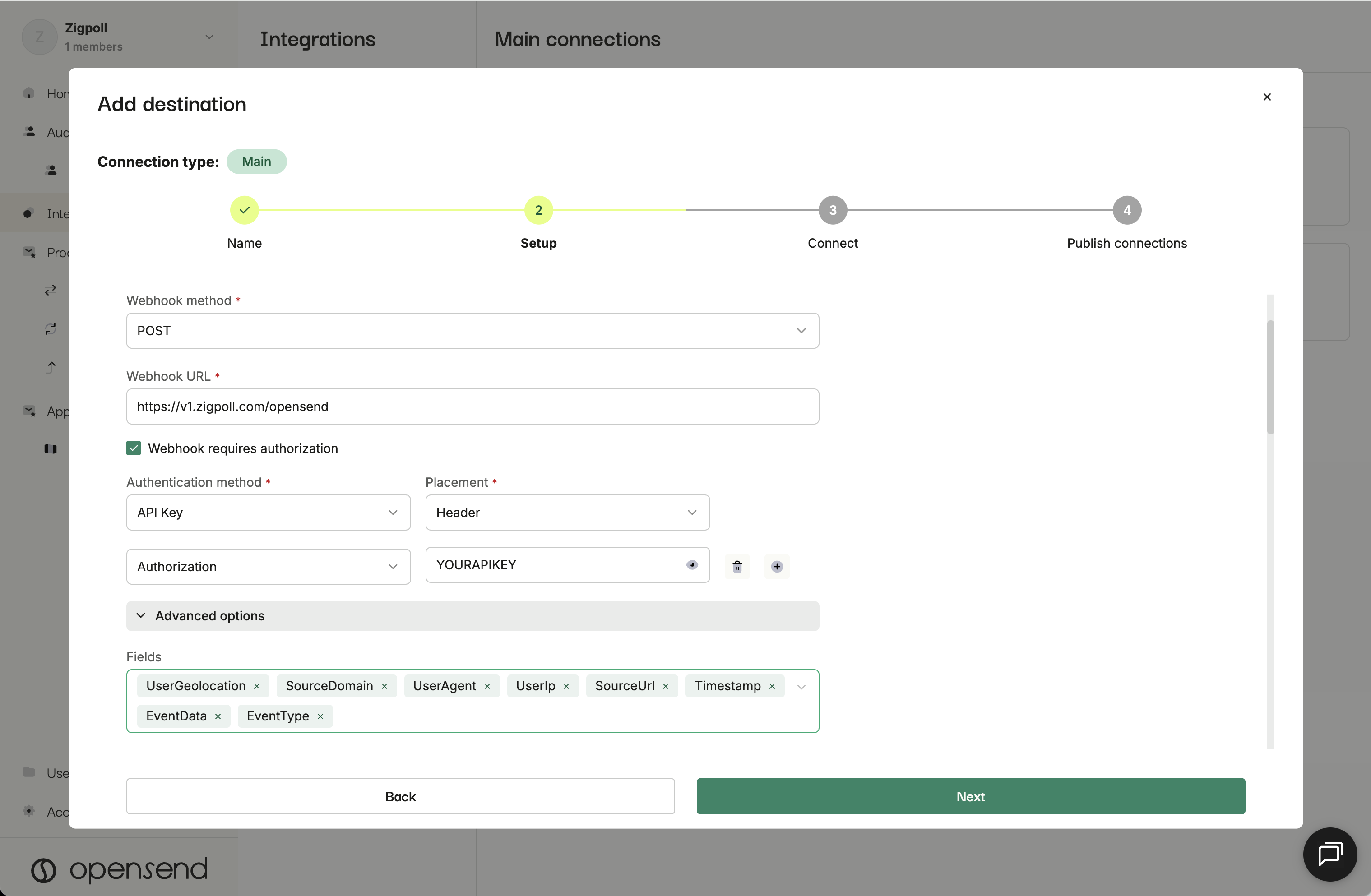 5. Enter **<https://v1.zigpoll.com/opensend>** where it says Webhook URL